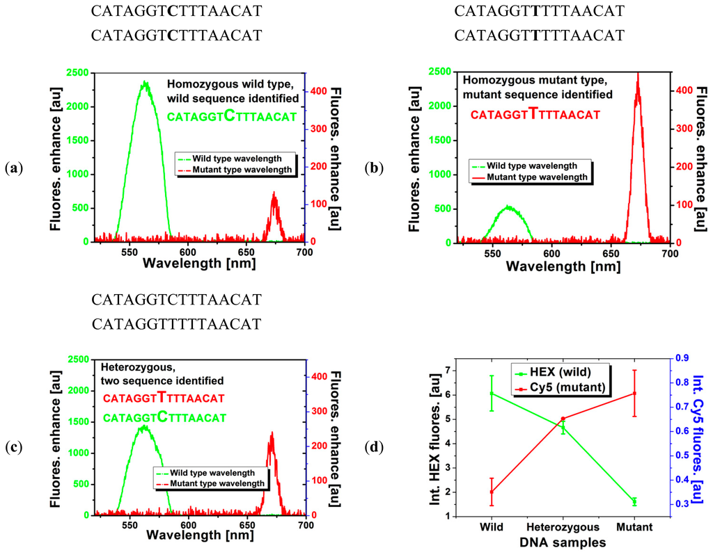 The results of the hybridization test, in which the dual-MB immobilized SCFs were loaded with different DNA solution containing either one type of DNA or both and fluorescence enhancements were recorded, is shown in Figure 4. When the fiber was filled with a buffer solution containing one type of DNA, either wild-type or mutant type (Figure 4a,b), essentially only one type of MB was undergoing conformational change due to target sequence binding to the probe in the MB loop, as evidenced by the enhancement of fluorescence at only one wavelength (Figure 4a is for fiber filled with wild-type DNA solution and Figure 4c is for fiber filled with mutant-type DNA solution). On the other hand, once the fiber is filled with DNA solution containing both the wild and mutant sequence (Figure 4c), both MBs experienced conformational changes as the fluorescence enhancement were obtained at both wavelengths. Of course, the level of enhancement should be lower than the case of single DNA sequence since it is a competing reaction, consistent with the case of genotyping SNPs using MBs in solution [1]. Therefore, the proposed dual-type MB immobilized SCF clearly functions as a SNP genotyping platform. Figure 4d shows the integrated intensity for the HEX (left) and Cy5 (right) fluorescence. Here sample is considered heterozygous if the two integrated intensities of the two dyes are close to each other while well-separated values of the fluorescence indicate homozygosity. It should be noted that the performance of the MBs immobilized on the surface of the SCF was somewhat deteriorated compared with the case of in-solution measurement. This is partly due to the steric hindrance of the surface on the MB as well as MBs to each other. In general it is not possible to obtain similar performance for in-solution (same phase) reaction and immobilized/liquid (different phase) reaction however it might be improved by optimizing the buffer condition as well as fine-tuning the design of the MBs.