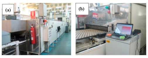 In many industrial sectors, it is necessary to maintain critical variables with a high degree of accuracy and uniformity. The food industry dedicated to the production of biscuits and pastries is an example. In this sector, tunnel ovens are used for the baking process. Tunnel ovens are designed for very large, fully automated, continuous processes and they can reach a length of up to 150 m, with temperatures ranging between 200 °C and 250 °C. A tunnel oven can be seen in Figure 1a,b.