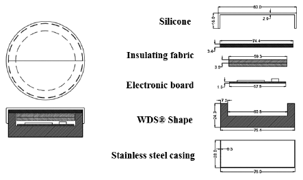 So, to try and to reduce the equipment dimensions without affecting its robustness, its insulating capacity and its cost, a new model was designed and built based on a stainless steel casing, and a WDS® Shape insulation on the bottom and sides as can be seen in Figure 9a. The electronic circuit board was covered by a robust but flexible insulating ceramic fabric that was easy to cut and sufficiently solid.