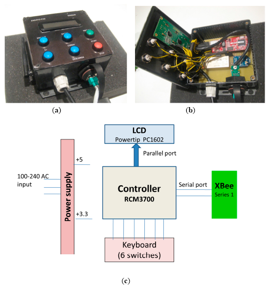 The system also incorporates a transmission module that guarantees Zigbee communications, both read and write, using the xBee transceiver. This device communicates with the base unit discussed earlier. The microcontroller manages high-level protocol communication, data and digital signal conditioning for temperature sensor. It also deals with calibration functions and alarm management.