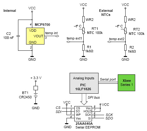 Up to four sensors can be connected to the converter leaving the rest of the channels free for future extensions. The external temperature sensors are made up of two accurate NTCs. The inside “eBiscuit” temperature is measured by a MCP9700 IC sensor. This linear active thermistor is an analog temperature sensor that converts temperature to analog voltage.