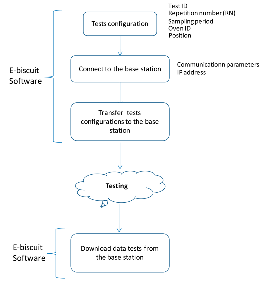 A software was implemented to cover three type of functionalities identified at the analysis phase: test management, communications between the base station and the “eBiscuit” dataloggers and between the base station and the PC, and finally, report of results. A test can be made up of one or several data captures, which consists of one “eBiscuit” going through a defined tunnel oven. The general sequence of a test can be seen in Figure 14.