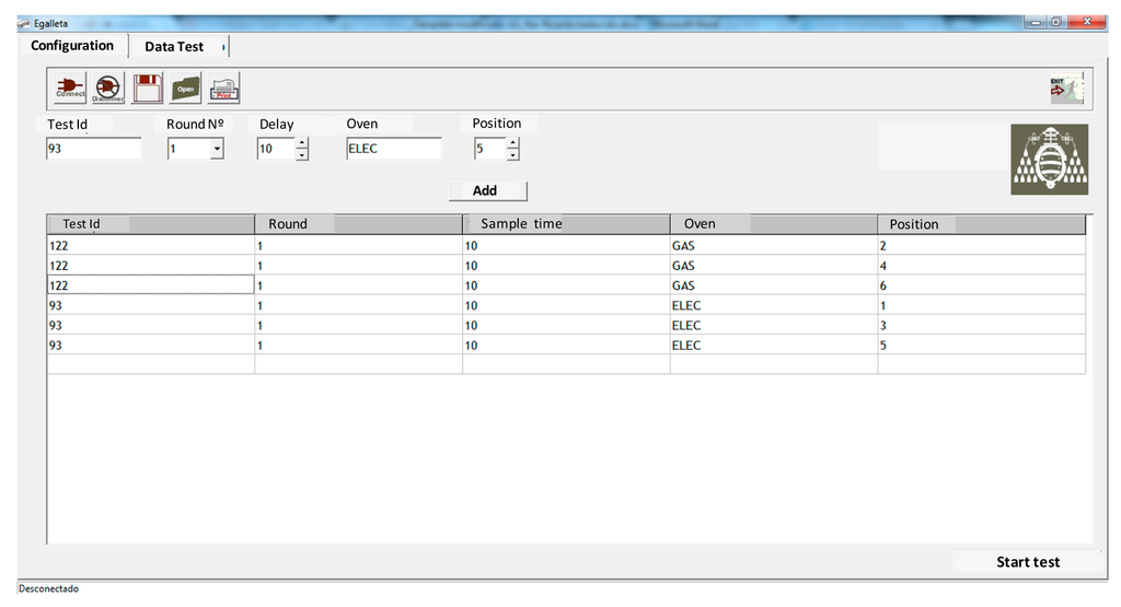 The operating mode in place together with the data measurement and acquisition systems is as follows: first, a computer is used to plan the group of tests you would like to be carried out in the oven (test ID, oven data, dataloggers to be used, test duration, location on the oven conveyor belt, etc.). Once the tests have been configured, they are downloaded to the base station. Next, the base station wirelessly downloads the desired test to each “eBiscuit” sensor. In this way, data acquisition can be carried out using the established configuration without the need for specialised personnel. Finally, once the tests have finished, the captured data is transmitted to the base station by each datalogger for further analysis [17].