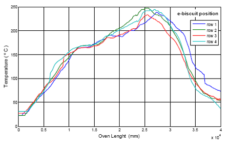 The tests consisted of four “eBiscuit” data loggers located in four different rows aligned to the same column of the conveyor belt. The test data collected is shown in Figures 18 and 19. They represent the temperature cooking conditions every biscuit is subject to at four different locations inside the oven. It is worth notice the different temperature distribution between both ovens, being more uniform in the electric one.