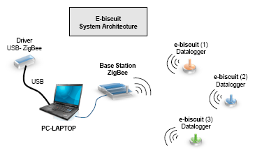 The system is made up of two fundamental modules as shown in Figure 2: the base station and the “eBiscuit” datalogger. These two modules communicate by the Zigbee protocol [19]. The electronic design of these two modules is described in the following sections [20].