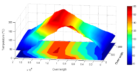 A 3D presentation of the oven's allocation is shown with the acquired data, in reference to axis X (cooking length of the oven) and axis Y (width of the cooking belt). Results are shown in Figures 20 and 21 [23].