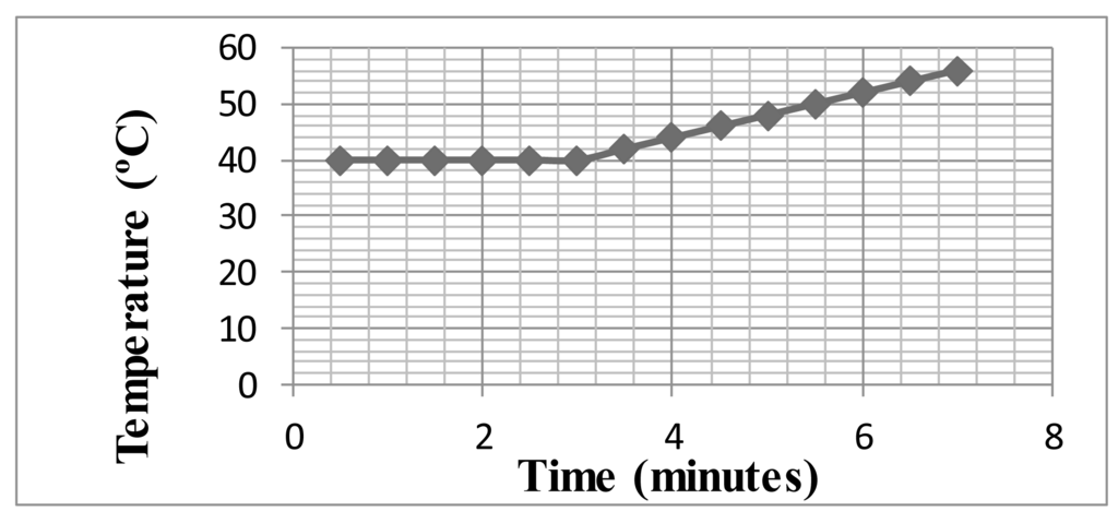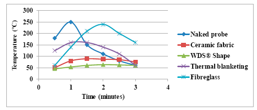 In order to check the insulating capacity of the different materials, a Resistance Temperature Detector (RTD) probe was placed inside an 8 mm thick cylinder made from the different insulating materials. The results obtained after applying hot air with a heat gun at 250 °C from a distance of 8 cm for 1 min are shown in Figure 6.