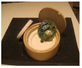 As can be seen in Figure 4, the temperature inside the “eBiscuit” reached 80 °C in 3 min. This is not acceptable for a datalogger to be used inside a tunnel oven, as its electronic system could get damaged if this temperature is reached at any moment during the baking process, which is estimated to last an average time of 10 min. A second prototype was designed and built using a PEEK casing with the interior filled with an insulating material. Tests were carried out using various types of insulation to ascertain the best-suited material, see Figure 5: