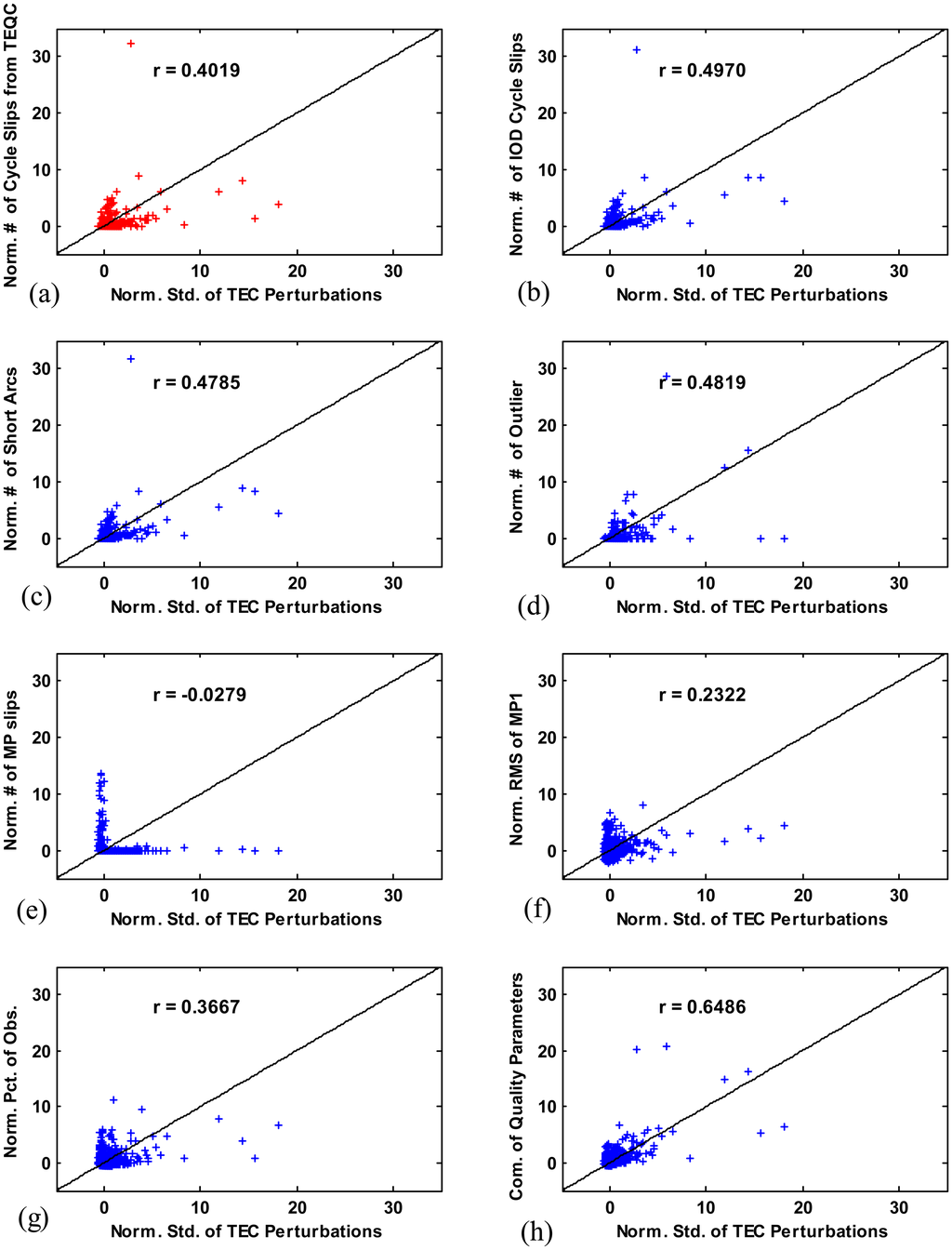 The six quality parameters (the number of IOD cycle slips, the number of short arcs, the number of outliers, the number of MP slips, the RMS of MP1, and the percentage of observation) obtained from the proposed method in this paper are calculated, averaged over seven days, normalized over all stations, and plotted along the y-axis in Figure 10b–g. As shown in Figure 10b, the TEC perturbation is more highly correlated with the number of IOD cycle slips (r= 0.4970) than with the number of cycle slips (r= 0.4019) derived from TEQC. This result demonstrates that the cycle slip detection of the proposed method performs better and its output more accurately represents GPS data quality. The correlation coefficients were also considerably high in the cases of the number of short arcs (r = 0.4785) and the number of outliers (r = 0.4891), indicating that these would affect the quality of ionospheric data. The correlations of TEC perturbation with MP1 and the percentage of observation are not strong, and that with the number of MP slips which are not visible on TEC estimates is weak. Assuming that the normalized quality parameters are independent and the sum of the normalized quality parameters has a normal distribution, we combine multiple quality parameters into a new quality parameter which has a stronger correlation with TEC perturbation. As shown in Figure 10h, the correlation increased (r= 0.6486) after adding the three quality parameters which have the first to third highest correlation: the number of IOD cycle slip, the number of outliers, and percentage of observation. In this combination set, the number of short arcs was not included to avoid adding duplicated information because its distribution is almost equal to that of the number of IOD cycle slips. More effective station selection would be possible using the parameter with higher correlation (which will be discussed in the following subsection).