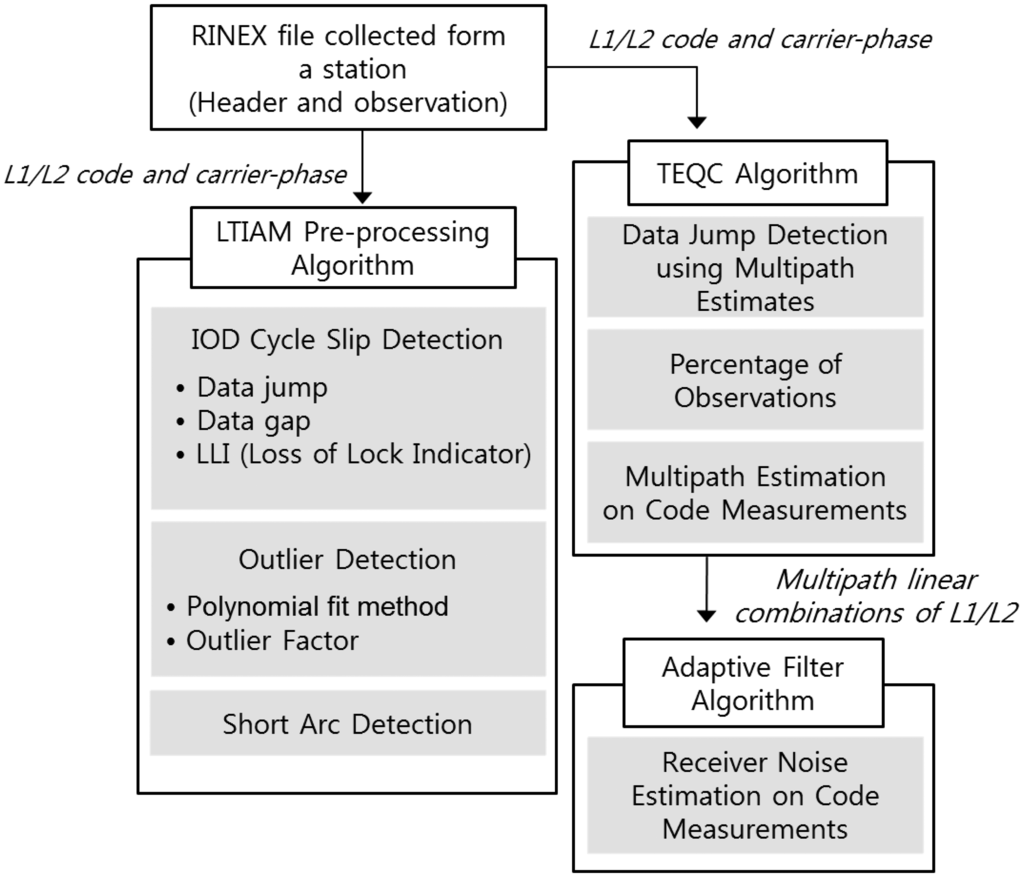A methodology for determining the quality of GNSS data has been developed by utilizing the GNSS data pre-processing technique for ionospheric data analysis as a basis and augmenting it with the TEQC algorithm and adaptive filter algorithm [11,17–19]. The purpose of this method is to provide comprehensive and accurate quality information to users for the selection of high-quality GNSS data. The input of the method is the RINEX file collected from a station of our interest for two consecutive days and the output is the GNSS data quality parameters of the corresponding station. This method is composed of mainly three parts, as shown in Figure 4: Long-Term Ionospheric Anomaly Monitoring (LTIAM) pre-processing algorithm, TEQC algorithm, and adaptive filter algorithm.