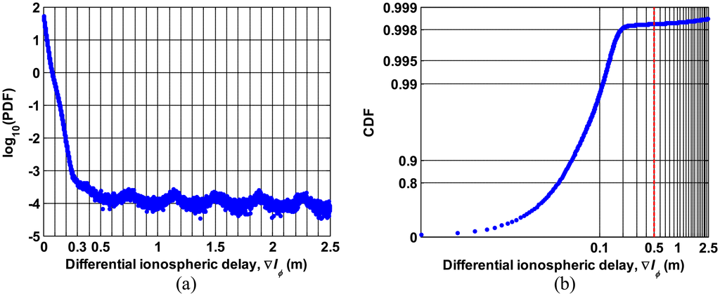 Figure 7a,b shows the PDF on a logarithmic scale and CDF of the differential residuals, ∇R, (where the residuals are the ionospheric delay data minus the polynomial fit) derived from data for seven consecutive days respectively. The distribution of ∇R shows that the probability is very small (on the order of 10−4) for ∇R greater than 0.5 m. As shown in Figure 7b, the probability that ∇R exceeds 0.5 m is approximately 0.02 percent. A threshold of 0.5 m is used for outlier detection in this study.