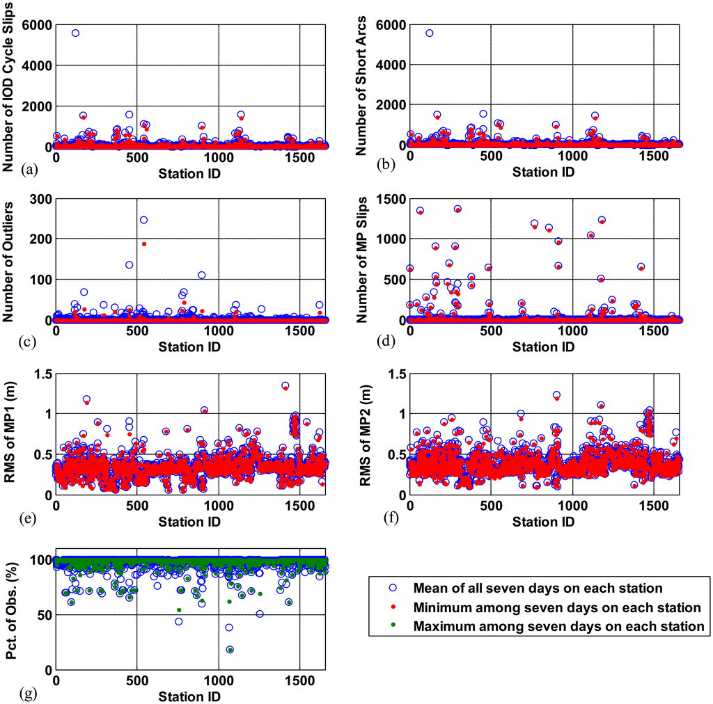 In most quality parameters, better data quality results in smaller values. However, higher values of percentage of observations indicate better quality of data. Thus, the mean values (blue circle) and the maximum values (green dots) of the percentage of observations of each station are compared to confirm that the poor data quality of a station persists for an extended period. In the percentage of observations, the maximum value (green dots) of a station across seven days and the mean value (blue circle) over seven days are also close together for most stations as shown in Figure 8g. The mean value of the percentage of observations over all days and all stations is 97.39 percent. As can be seen in Figure 8a–g, the range of good and poor performance varies noticeably for each quality parameter. It can be observed that most stations maintain similar performance for the duration of this data set. This information suggests that we can select high quality GNSS data in a station basis and the quality parameters of each station should be useful for the selection.
