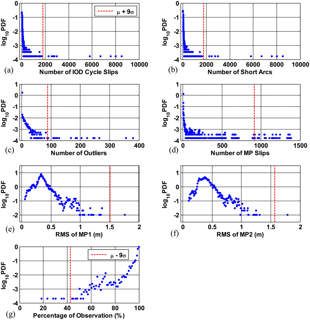 Figure 9a through 9g show the PDF of each quality parameter on each station per day in logarithmic scale. These test statistics are obtained from data collected for the seven days in Table 1. As an example, the PDF of the number of IOD cycle slips on each station per day is shown in Figure 9a. The dashed vertical lines in Figure 9a–f refer to the value of μ+9σ (the mean value plus 9 times the sample standard deviation) for each parameter. In Figure 9a–f, since data (blue) exist continuously from 0 to this line and the continuity of data ceases beyond this line, the data that go beyond μ+9σ are considered to be extreme outliers (i.e., stations with poor data quality). The dashed vertical line in Figure 9g represents the value of μ+9σ. The percentage of observations which falls lower than this line indicates extremely poor data quality.