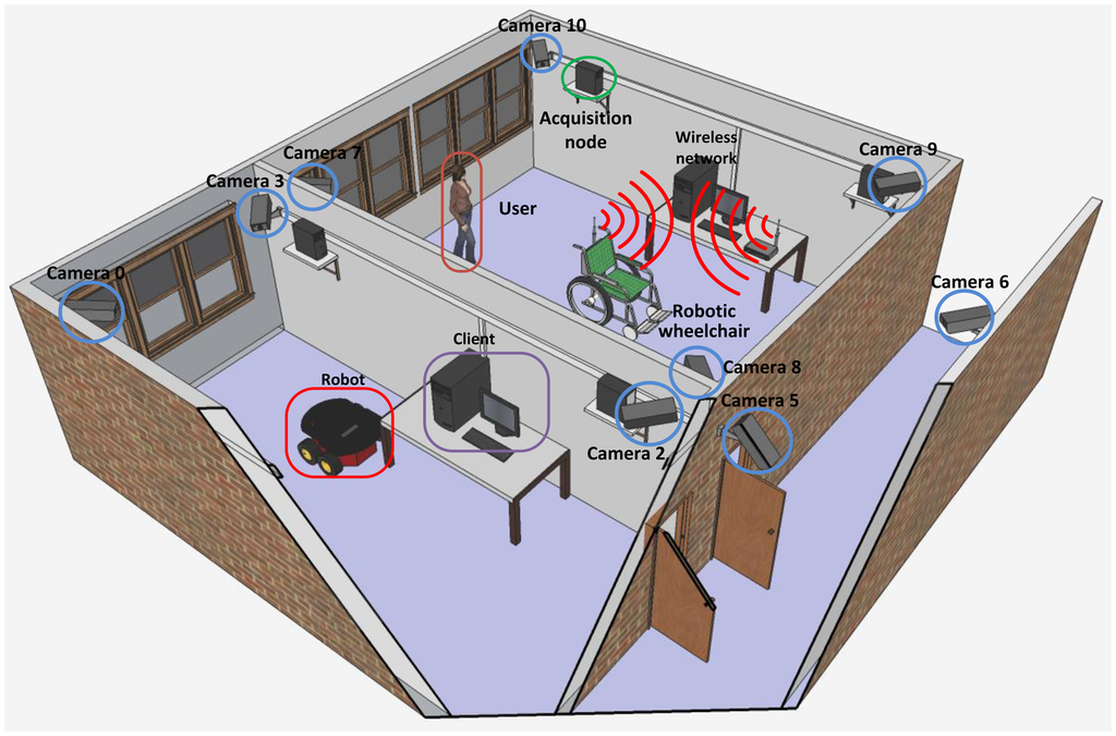 In this context, this work presents the intelligent space built at the Federal University of Espirito Santo (UFES). Specifically, the intelligent space described in this paper aims to achieve localization, identification and control of mobile robots or robotic wheelchairs. In [21], a robot navigation control strategy using a network of cameras was proposed and tested in a 45-m2 laboratory, demonstrating the viability of the usage of such a sensor in the control of mobile robots.