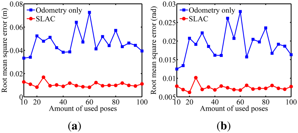 The graphs show that, for 20 or more robot poses, the proposed algorithm achieves a good performance. The error peak happened when 15 poses were used in the simulations. It is worth mentioning that the initial values of the calibration parameters, used to start the optimization done by the proposed algorithm, are very important. They may improve considerably the optimization and, thus, make the SLAC algorithm achieve better results. Besides that, by the graph shown in Figure 10, it is possible to conclude that the proposed algorithm increases the precision in localizing the robot by using visual information in the process.