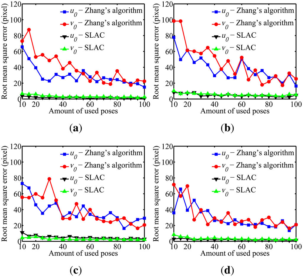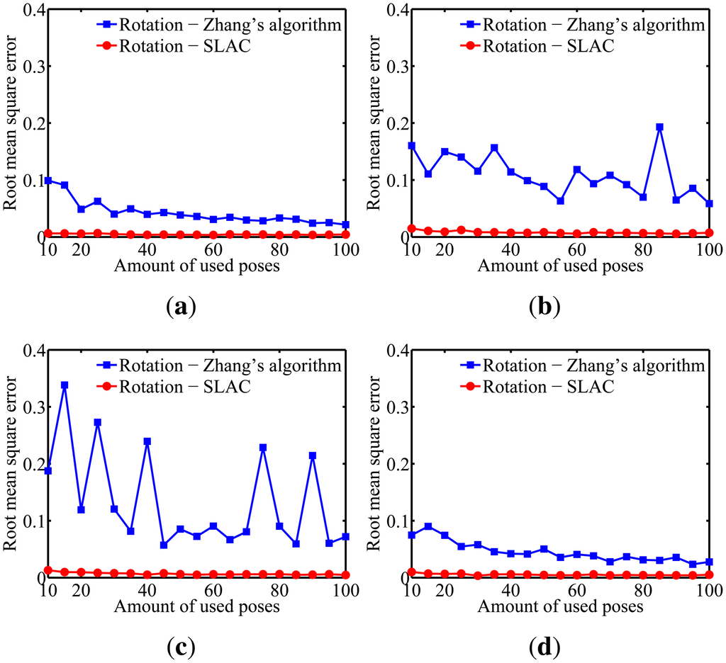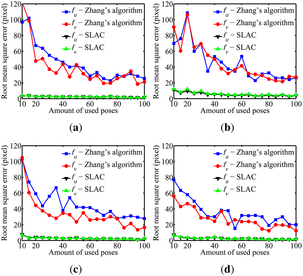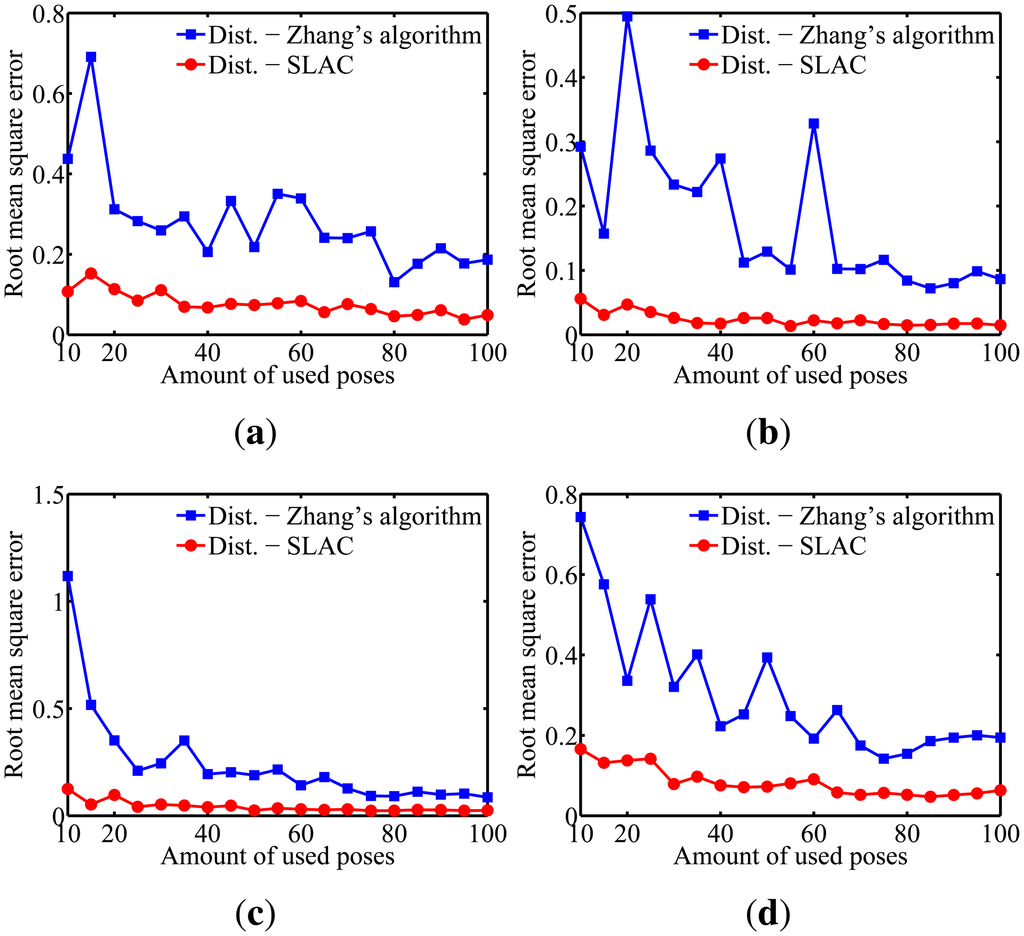 To evaluate the performance of the proposed algorithm for localizing the robot, the mean squared error (RMSE) in the robot poses estimated by the odometry sensors and by the proposed algorithm are compared in Figure 10. Furthermore, the evaluation of the results on cameras calibration obtained by the proposed algorithm was done through comparing it to the well known Zhang algorithm [29]. Figures 11, 12, 13, 14 and 15 show the RMSE for the cameras' parameters estimated by our algorithm, noted in the graphs as SLAC (simultaneous localization and calibration) and Zhang's algorithm.