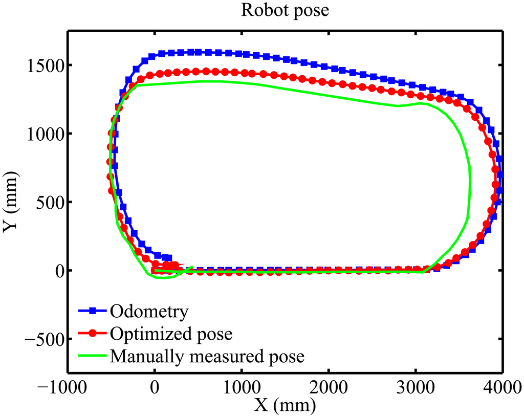 In order to evaluate the results for robot localization, the path performed by the mobile robot was measured manually, so it could be used as a reference. This reference path was obtained by attaching to the center of the robot a marker that drew down on the floor the trajectory during robot motion. After that, points on the path were measured considering a maximum error of 1.0 cm, that corresponds to the marker width. In Figure 16, the location of the robot given by its odometry and the proposed algorithm are compared to the reference path. It is possible to see that the robot poses estimated by our algorithm approximate the reference measurements.