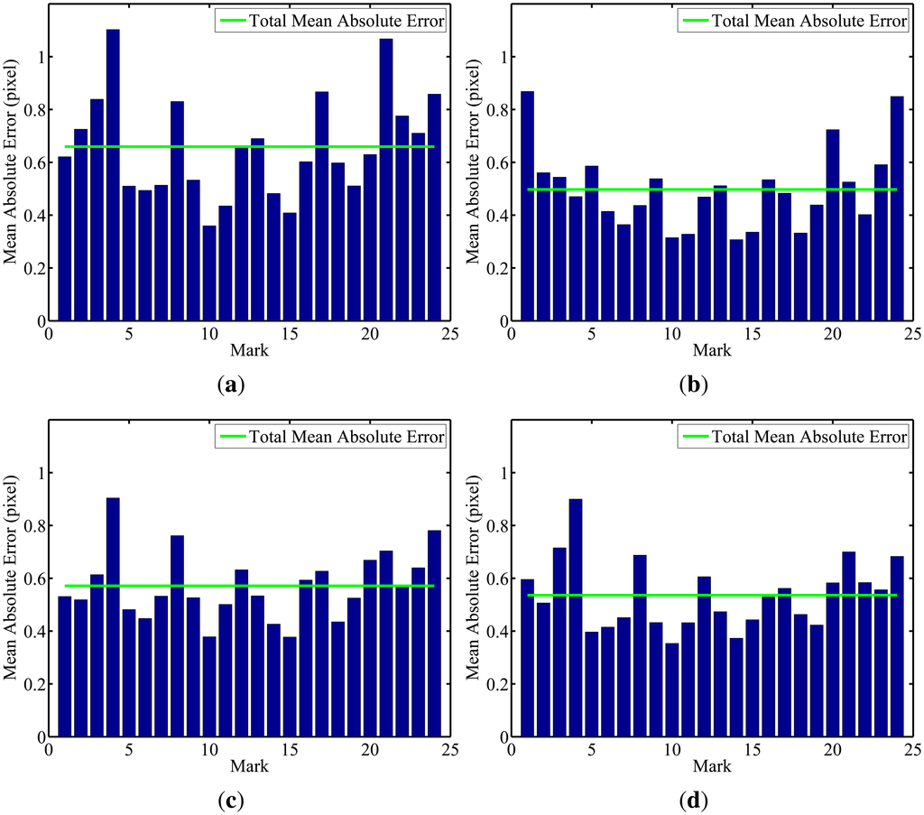 In the second part of the experiment, the robot performed two different paths, an oval one and an eight-shaped one (lemniscate curve), once again covering the entire laboratory. In both cases, the four cameras in the intelligent space were used. To validate the calibration algorithm, reprojections were made using the calculated parameters and the calibration pattern images used in the experiment. The mean errors in the reprojections of the 3D points for each of the 24 marks is shown in Figures 17 and 18.