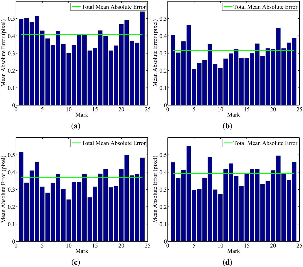 Once the 24 marks are classified and sorted, it is necessary to check if they actually form the calibration pattern. To perform this task, the distance between neighboring marks in each line is calculated and normalized. Then, for each line, the standard deviation of these distances is calculated. The same is done to the marks in each column. If all of the standard deviation values are smaller than an empirical threshold, then the 24 marks are considered part of the calibration pattern. In the case that at least one of these values is greater than the defined threshold, the frame is discarded, and it is considered that the calibration pattern could not be detected in that frame.