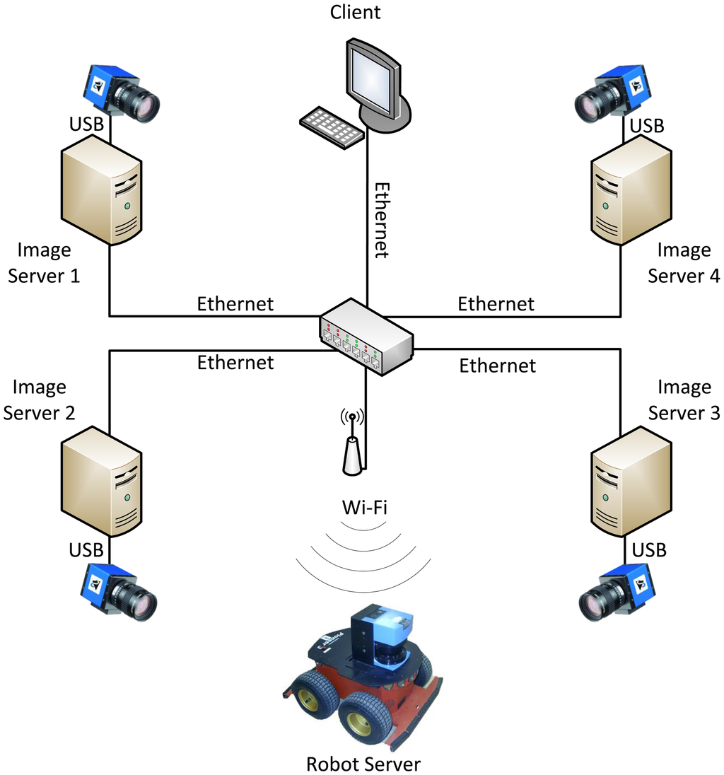 The processing nodes are interconnected via a switch in a LAN (local area network) for a gigabit Ethernet interface, using a star topology. Besides, a wireless router was added to the network to allow the robot to connect to the system. A simplified schematic of hardware and software structure representing four cameras of one of the intelligent space's laboratories is shown in Figure 3.