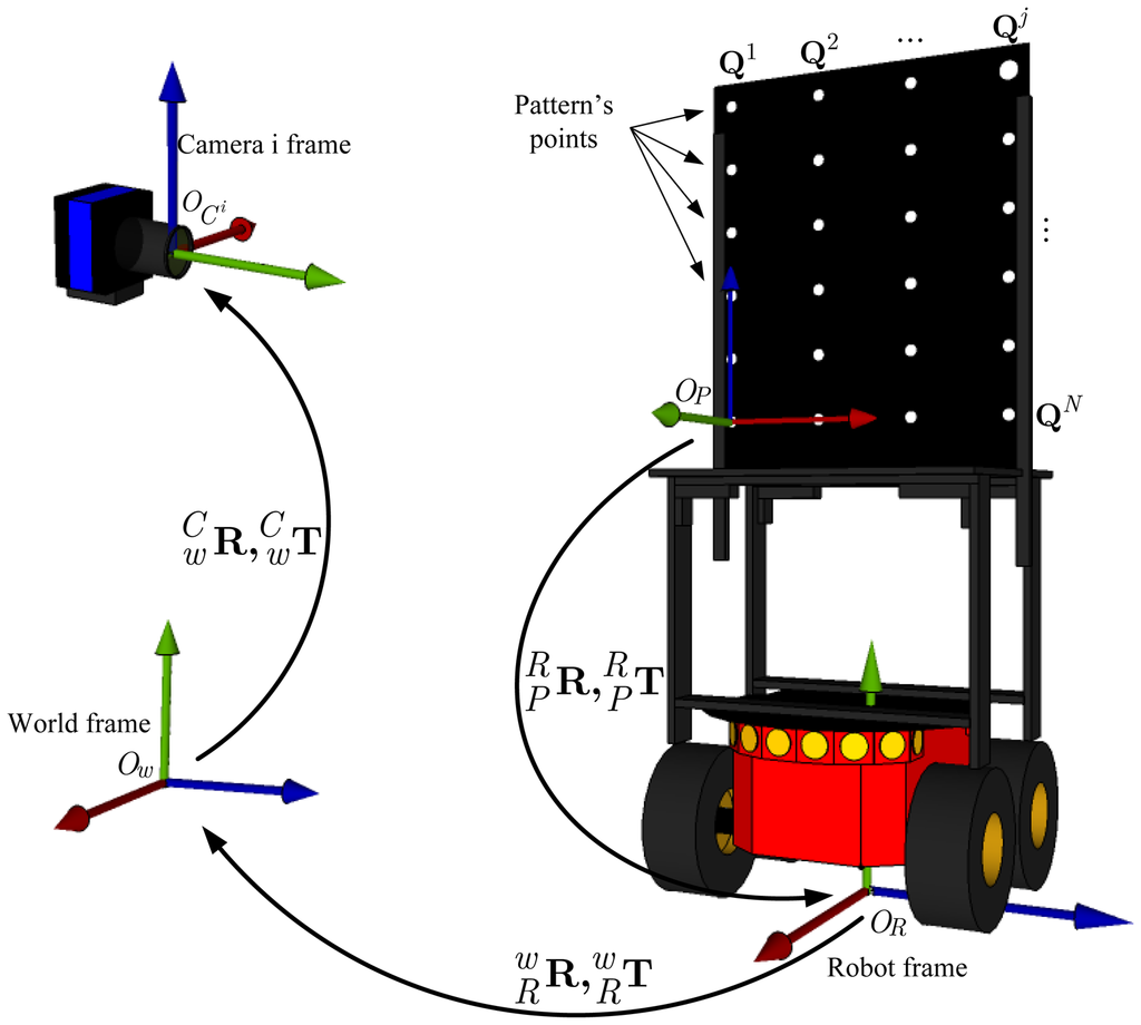 As the reference frame attached to the calibration pattern does not necessarily coincide with the robot frame, it is important to define a rotation and translation that describe the coordinate transformation between the pattern reference frame and the robot frame. After changing coordinates to the robot frame, the j-th point on the calibration pattern is represented as Mj.
