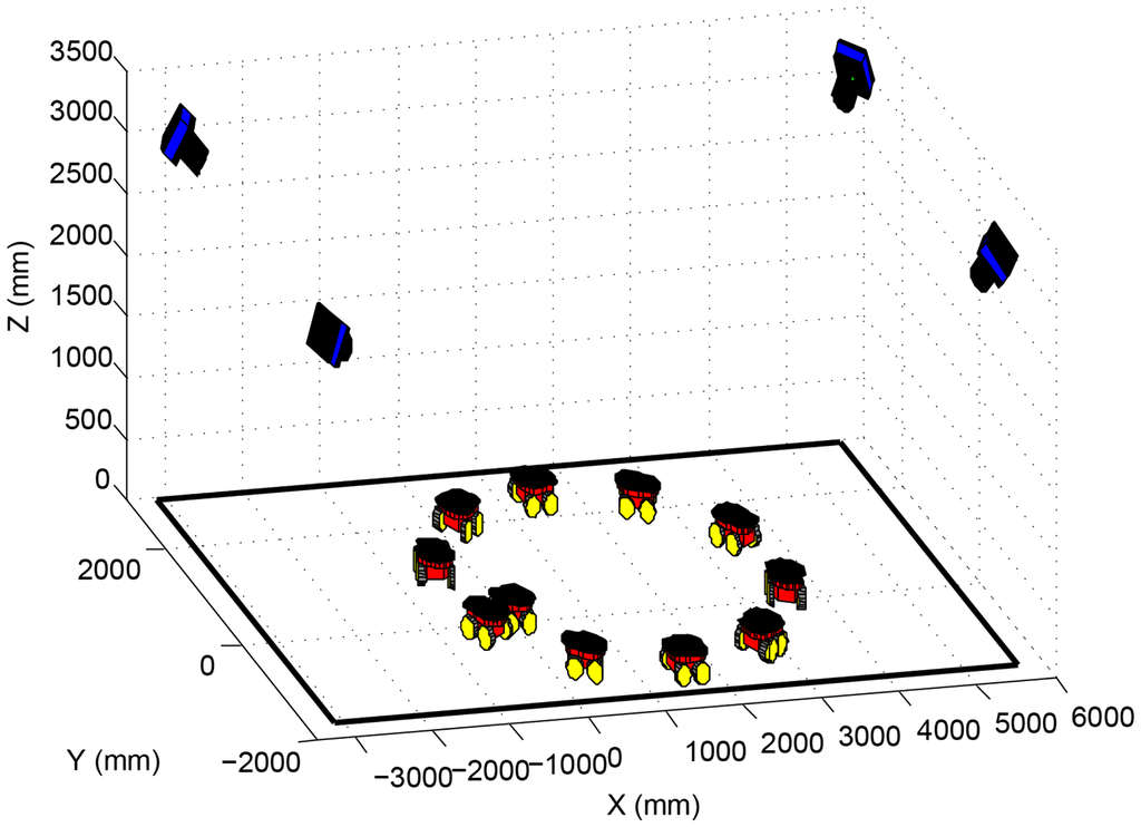 In the simulations presented in this section, four cameras and one robot were simulated, as shown in Figure 9. The robot performed a circular path in the laboratory, as if it were controlled by a joystick, going through the four cameras' field of view. A 60 cm × 60 cm calibration pattern was considered fixed on top of the robot, with 21 equally distant marks, distributed in three lines.