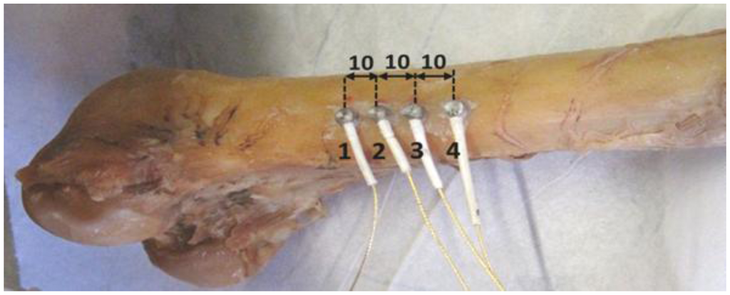 The nature of the preliminary results (separating burst in the waveforms) imposed the use of multiple receivers in order to record the changes during propagation. The separation distance between the sensors was 10 mm (see Figure 1) and the pulse was excited by fractures of mechanical pencil leads of HB 0.5 approximately 5 mm in front of the first sensor. Excitation of elastic waves with pencil lead breaks is a common way either to check the performance of AE sensors [20] or to conduct ultrasonic studies [21]. The length and the hardness of the pencil lead are prescribed in order for the excitation to be repeatable. The edge of the lead is placed on the surface at the specified point and then it is broken by a gentle push. Care should be taken that the whole mechanical pencil does not touch the surface and creates extra noise signals. This is a realistic excitation, as it originates from the fracture of lead, and it carries quite a broad band of frequencies. Therefore, it can excite multiple modes, as opposed to narrow spectrum which is helpful for generating fewer modes or even a unique mode [22]. The sensors were of Pico type with a broadband response and maximum sensitivity at 450 kHz. The electric waveforms were pre-amplified by 40 dB and recorded in four synchronized channels with sampling rate of 10 MHz in the acquisition board (Mistras Holdings micro-II, 8 channels). Acoustic coupling was enhanced by Vaseline grease and the sensor array was placed on areas of the femur that were flat enough in order to avoid contact problems. The sensors were attached repeatedly in different spots to examine different wave paths. Measurements were conducted in five different femur specimens. Example of the sensor positioning is shown in Figure 1. The set up was first applied to a bulk steel specimen of thickness equal to 85 mm, in order to get a reference of a “homogeneous” medium with microstructure and thickness not interacting with the propagated wavelengths. Considering the frequencies of approximately 150 to 300 kHz excited by the lead break, the produced wavelengths are between 18 and 35 mm for longitudinal and 9–18 mm for Rayleigh. Therefore, there is no interaction with the thickness, something that excludes the possibility that the measured waves in the steel specimen are plate waves. On the contrary the thickness of the cortical bone is between 5 and 7 mm, strongly interacting with the developed wave lengths resulting in the propagation of plate waves in the specific experiment. It should be mentioned in any case that bulk waves in bone tissue can also be supported but for higher frequencies as has been demonstrated in a previous study [23], where the frequency of 1 MHz allowed the propagation of Rayleigh and longitudinal waves in bone with cortical bone thickness of 6.5 mm.