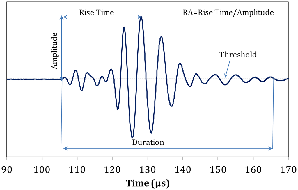 Apart from wave velocity and attenuation, other waveform parameters are also important mainly for AE monitoring. Some of them are the RA value and the average frequency (AF). RA is the ratio of Rise Time over the maximum amplitude (see Figure 10) and AF is the number of threshold crossings over the duration of the signal. Additionally, central frequency (CF) is the frequency with the maximum magnitude in the frequency domain. In engineering materials a shift to high RA values and low frequency indicates a shift from tensile to shear cracking sources [39].