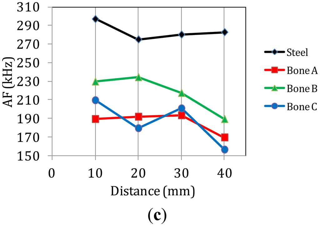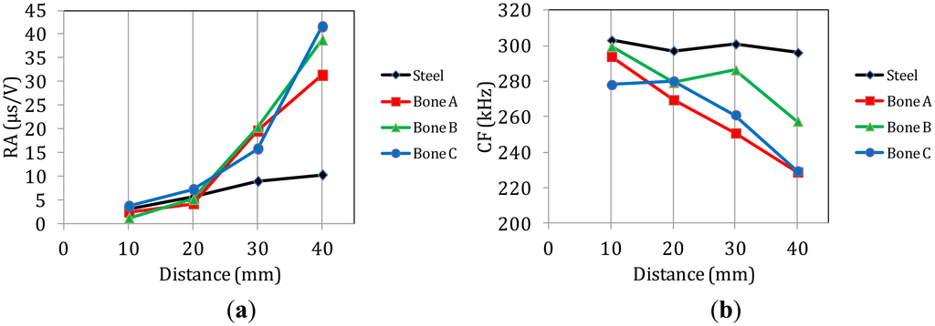 Figure 11a shows the RA for the successive sensors for steel and different bone specimens as a response to the simulated fracture of the pencil lead. The RA of the waveforms captured on steel increases smoothly mainly due to the slower propagation of the Rayleigh that increases the delay between the onset and the maximum (see waveforms of Figure 2). The corresponding increase for the bone specimens is much stronger. The values at the last receiver are more than 10 times higher than the first, a change that occurs for additional propagation of just 30 mm. Specifically, nearby the excitation, RA is always less than 5 μs/V while 30 mm further it approaches 45 μs/V. This alteration by a factor of 10 is too strong and would certainly mask any change owing to the actual fracture mode. Concerning the central frequency (Figure 11b), the pulses in steel do not seem to systematically lose their content with distance since all of them are around 300 kHz. However, again the femur material has a much stronger influence on the frequency content as the CF starts between 280 kHz and 300 kHz for the transducer near-by the excitation but decreases to around 250 kHz 30 mm away for most of the measurements. Figure 11c shows the corresponding trend of AF which although is still a frequency indicator, it is measured through the threshold crossings of the time domain waveform. Despite its seemingly rough and threshold-dependent nature it has proven very powerful for the characterization of cracking modes in different materials. Again a strong decrease is depicted for the bone specimens while the pulses in steel do not seem to clearly lose their AF. These changes in waveform parameters for additional propagation of just a few mm highlight the importance of waveform distortion in AE analysis in heterogeneous media like bone. The need to take distortion into account has been demonstrated for engineering materials where the waveform parameters are used for classification of fracture modes and any distortion of the shape due to scattering is crucial [40]. However, it has not been considered in bio-materials although they are more complex. Therefore, if the aim of AE monitoring is not limited to measuring the accumulated number of AE activities and more specific information is sought for the dominant fracture mechanisms of the tissue and how they are triggered relatively to the applied load, the effect of distortion should be cleared or at least taken into consideration [41].