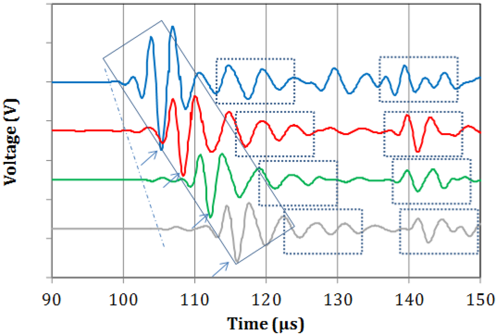 Typical waveforms from the four sensors recorded on the metal specimen are shown in Figure 2. A weak onset is seen in all of the waveforms trailed by a much stronger portion of the waveform. These two bursts can presumably be identified as the longitudinal and Rayleigh waves respectively as the thickness of the steel block is too large to support plate waves in this frequency range. Since Rayleigh waves travel on a lower velocity, the 2nd bursts arrives at increasingly later times as the distance between excitation and receiver increases from sensor 1 to 4. Taking into account the distance between the sensors and the delay between the onset points (see dash dot line), the velocity of the longitudinal mode is calculated at 5464 m/s. This value is typical of steel material and it was repeatable on three different measurements on the material. It can be seen that the Rayleigh burst maintains a similar pattern throughout its propagation from the first to the last sensor (inside the diagonal rectangle). This is indicative of the homogeneity of the material and makes it identifiable throughout its propagation [24,25]. Based on a reference peak (i.e., the strong negative indicated by arrows) the velocity of this mode is 2779 m/s. Considering the longitudinal velocity and the thickness of the metal block, reflections are expected at approximately 18–20 μs. The first and second reflections can be seen in the dashed rectangular boxes of Figure 2, with the first trailing or slightly overlapping with the Rayleigh burst.