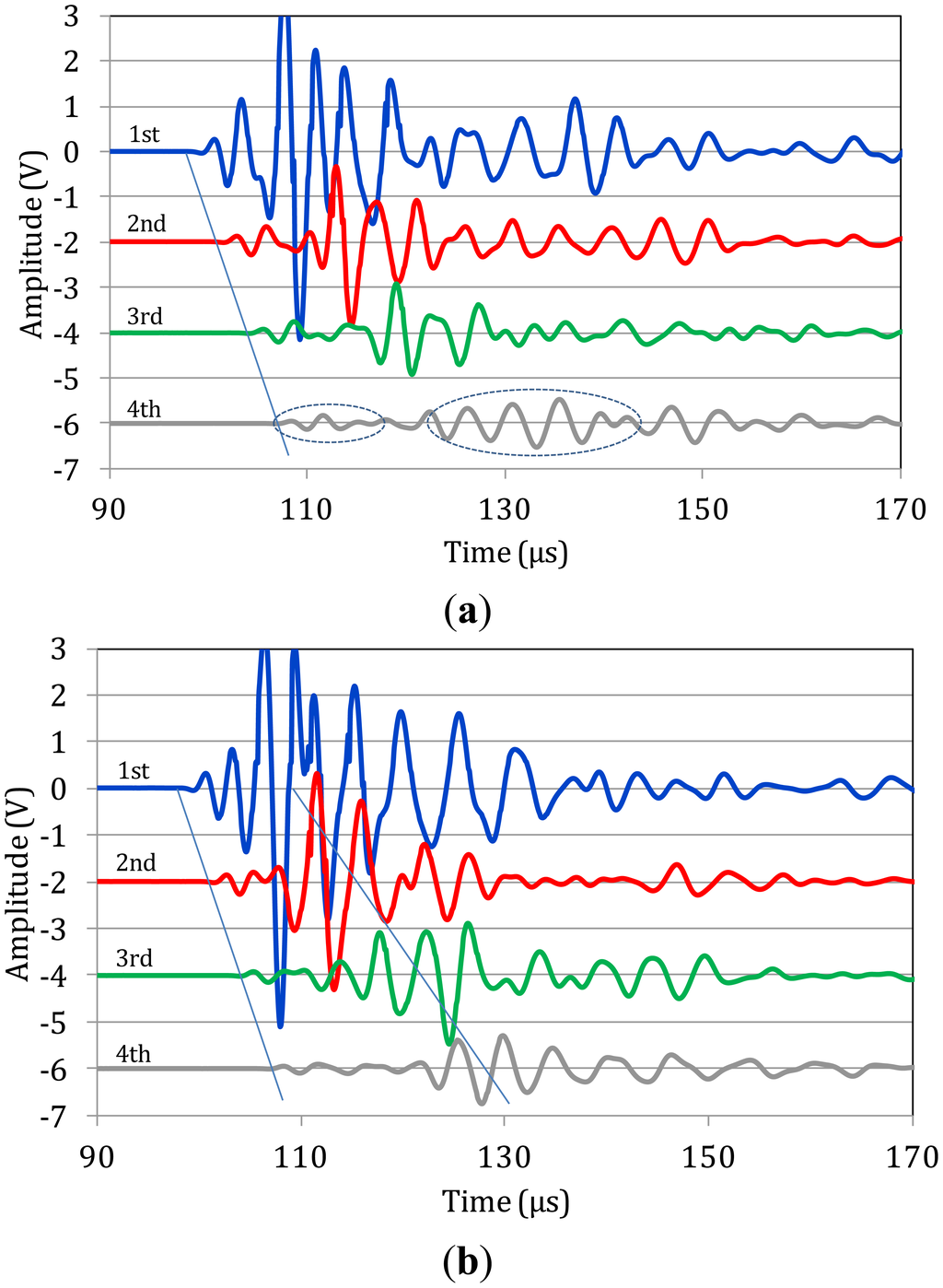 Figure 3a–c shows corresponding typical measurements on bone specimens. Focusing first on Figure 3a one can see that as the propagation distance increases (from 1st to 4th sensor) a mode separation becomes evident. At the 4th sensor it is clear that a high-amplitude, low-frequency wave follows the initial weak arrivals (see ellipses). This separation is also seen on the waveforms of the 3rd and 2nd sensors, while on the 1st, the signals have not separated due to the short distance from the excitation. The exact same trend is seen for the next two cases of Figure 3b,c. The separation of different modes becomes more evident as the wave propagates further to the 4th receiver, while the duration of the large amplitude burst seems to stretch in time. Additionally, a “tail” is noted after the large amplitude mode, which can be the result of multiple reflections of bulk waves.