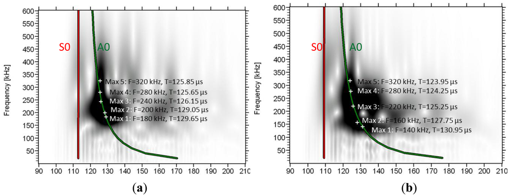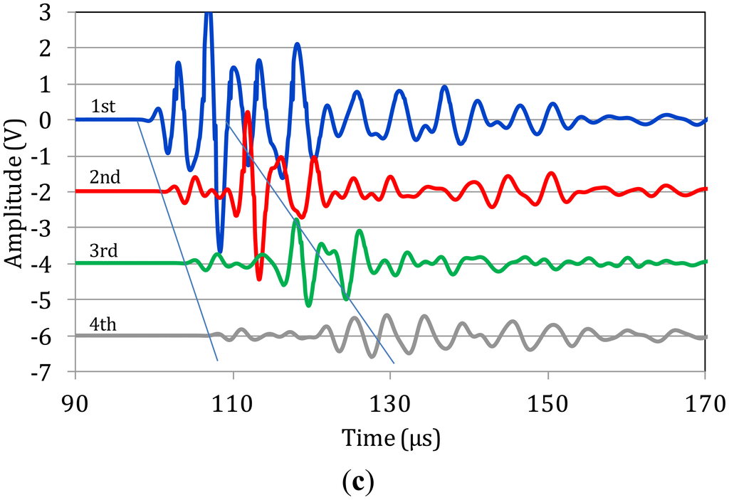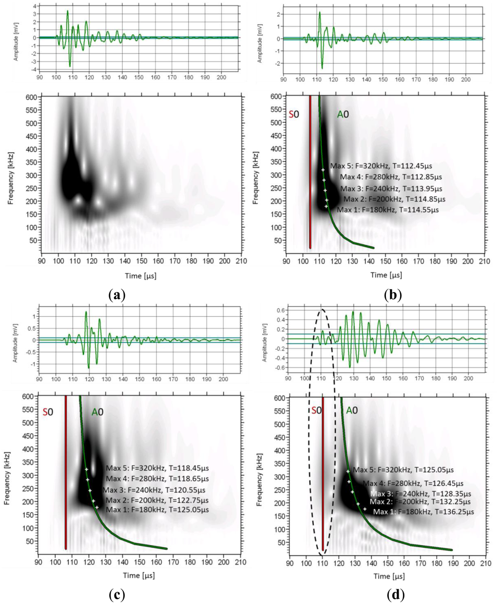 The WT based on the 1st receiver reveals a concentrated intensity between 100 and 120 μs, with frequencies from 100 kHz to approximately 500 kHz. In this case no mode separation can be assumed. As the wave propagates to the next receivers, the higher frequency components start to wear down and the intensity spreads to later time windows. In sensor 4 (Figure 7d), although the higher intensity is seen at the location of the second low frequency burst (120 to 160 μs), some energy is still visible earlier corresponding to the higher frequency, lower amplitude initial part of the signal which arrives at approximately 110 μs (see the connection to the waveform with the dash ellipse). On the same graphs the maximum intensity for certain frequencies is also seen by white cross symbols. It is clear that as the wave propagates further from sensor 1 to 4, the maxima of the lower frequencies shift to later times compared to the higher frequency components. As an example, the peak at 180 kHz arrives 2.1 μs later than the peak of 320 kHz in sensor 2 (Figure 7b), while in sensor 4 (Figure 7d), the delay between them is more than 10 μs. This increasing delay between different frequency components indicates the strong dispersion due to the microstructure, with higher frequencies propagating on higher speed.
