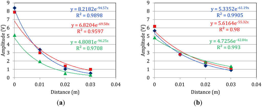 Correspondingly, the attenuation behavior of the same specimens was assessed by comparing the frequency dependent magnitude of the FFT of the waveforms of the last receiver to the first, which acts as reference, and is depicted in Figure 6a and b. Specifically, the FFT of the waveform collected at the last receiver (A4) was divided to the FFT of the first (A1) and this was normalized to the distance X, between them (30 mm or 0.03 m) in order to express the magnitude ratio, a(f), over the propagation distance: