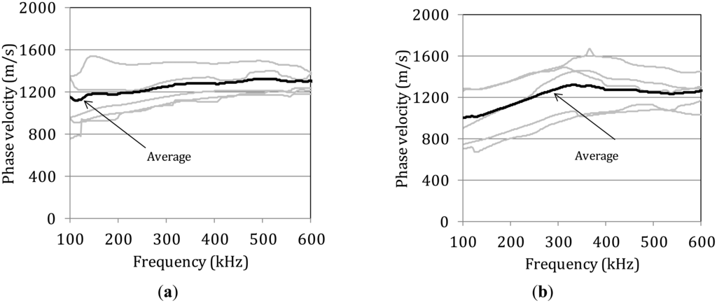 Based on the spectral content of the waveforms the phase velocity vs. frequency curve can be calculated [28]. Since it is obvious that different modes propagate, and in order to have reliable results the analysis was focused only on the large amplitude burst, forcing the rest of the waveform points to zero [29,30]. This procedure involves calculating the phase of the FFT of two waveforms (initial, i.e., sensor 1 and final, i.e., sensor 4), unwrapping of the phase information and calculation of the phase difference for each of the frequency components. This phase difference is proportional to the velocity of the frequency component and therefore, the dispersion curve is directly derived [28]. In Figure 5a several dispersion curves from different measurements on the femur specimen with thickness 7.1 mm are presented. The different curves exhibit strong experimental scatter which can be attributed to the heterogeneous structure of bone tissue. The heterogeneity makes any measurement unique even on the same specimen. In most of them a general increase of phase velocity is noted up to 500 or 600 kHz. The average of the lines is also drawn in the graph to more reliably show the increasing trend, without necessarily meaning that it is representative of the whole volume of the material. The average increase of wave velocity for this band of frequencies is more than 200 m/s from 1110 m/s to more than 1320 m/s. Figure 5b shows corresponding curves for the specimen with the lowest thickness of 5.8 mm. The scatter is similarly strong but there is a common trend of increase from 100 kHz to 400 kHz. In this case the average curve starts at less than 1000 m/s and increases up to 1320 for 350 kHz. The dispersive behavior of the bone specimens is in contrast with the metal dispersion curve which is a nearly straight line at the level of 3000 m/s [31]. This result is in good correspondence with recent measurements in porcine femur for the band of 150 kHz to 250 kHz that show a slight increase of group velocity for both modes which are again identified as the first symmetric and antisymmetric respectively [32]. The dependence of the phase velocity on the frequency shows the key role of the microstructure on wave propagation.