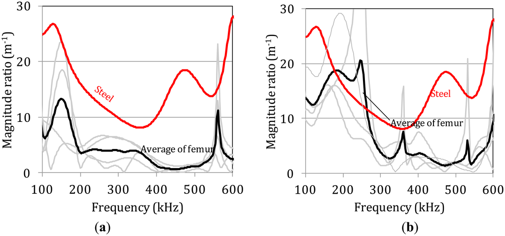 The experimental scatter of the curves is even higher between the different bone specimens while the average curves clearly show a decrease of the magnitude for the bands higher than 250 kHz compared to below 250 kHz. The corresponding curve for steel is much smoother and higher due to the relatively homogeneous nature of the material. Despite the scatter, the average magnitude rate for thickness 7.1 mm (Figure 6a) is lower than for 5.8 mm (Figure 6b) for almost all the frequency bands and especially below 300 kHz. This trend is in accordance with the amplitude decay measured by the maximum amplitude of the signal in the previous section.