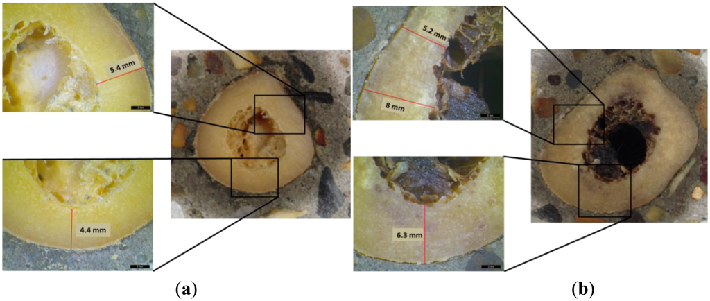 A femur cross-section consists of three layers: the periosteum or outside skin of the bone, the hard compact bone (cortical) and the bone marrow. Feik et al. demonstrated that cross-sections of cortical bone clearly show age-related differences in the thickness [37]. The compact bone area is highest in young ages and lower in older ones [38]. As it has already been discussed previously, the age of the cadavers ranged from 73 to 95 years. This means that the cortical bone area is expected to be relatively low. Cross sections of two femur specimens of the current study can be seen in Figure 9a and b. The thickness measurement is based on the cortical layer. The cortical thickness is derived by the magnified photographs from optical microscope. Those two femur specimens were selected based on the size differences. They correspond to the specimens with the largest thickness (7.1 mm in average) and the lowest at 5.8 mm. Those values have been measured as average of five measurements at the cross-section surface (see indicative values in Figure 9). In any case, it is clear from the pictures that the thickness in both femurs is not uniform. This is due to the inhomogeneous geometry of the femur tissue.