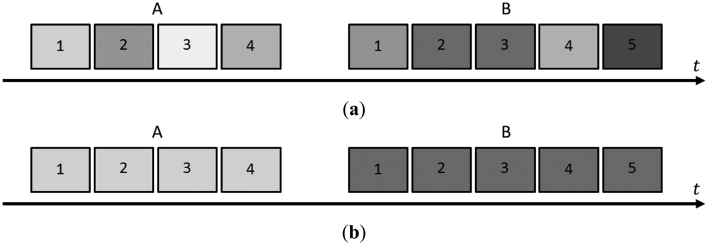 Simply calibrating a camera once or “every once in a while” may not be enough to achieve the desired object space reconstruction accuracy. Since consumer-grade digital cameras are not designed with photogrammetric applications in mind, their internal geometry may vary over time. Variations in the IOPs can be intentional or unintended. Intentional variations are usually due to the mode of operation, e.g., focusing every photo. Unintended variations are caused by the structural instability of the camera. In both cases, mechanical movements (e.g., sensor within the camera body, within the lens “tube” or the lens mount), routine handling, transportation, disassembly and reassembly of the lens from the camera body or other external forces, thermal effects, and influences in the processing chain play a role in changing the internal geometry [8]. Small, and hopefully insignificant, variations in the IOPs may occur within the course of a single data collection campaign. These variations are referred to as photo variant (the term used in the cited literature is actually “photo invariant”; however, the authors consider the term “photo variant” to be more appropriate; see Figure 1a) [9]. Technically, different IOP parameters must be used for each photo, but in practice this is often ignored. If the variations of the IOPs in each photo are not ignored but are solved for, the solution will not be reliable due to the correlations among the many parameters involved in the estimation process. Larger, and most likely significant, variations in the IOPs may occur between data collection campaigns. Those variations are referred to as block invariant (see Figure 1b), and the same IOP parameters must be applied to all photos within a certain block (i.e., a set of photos) [9].
