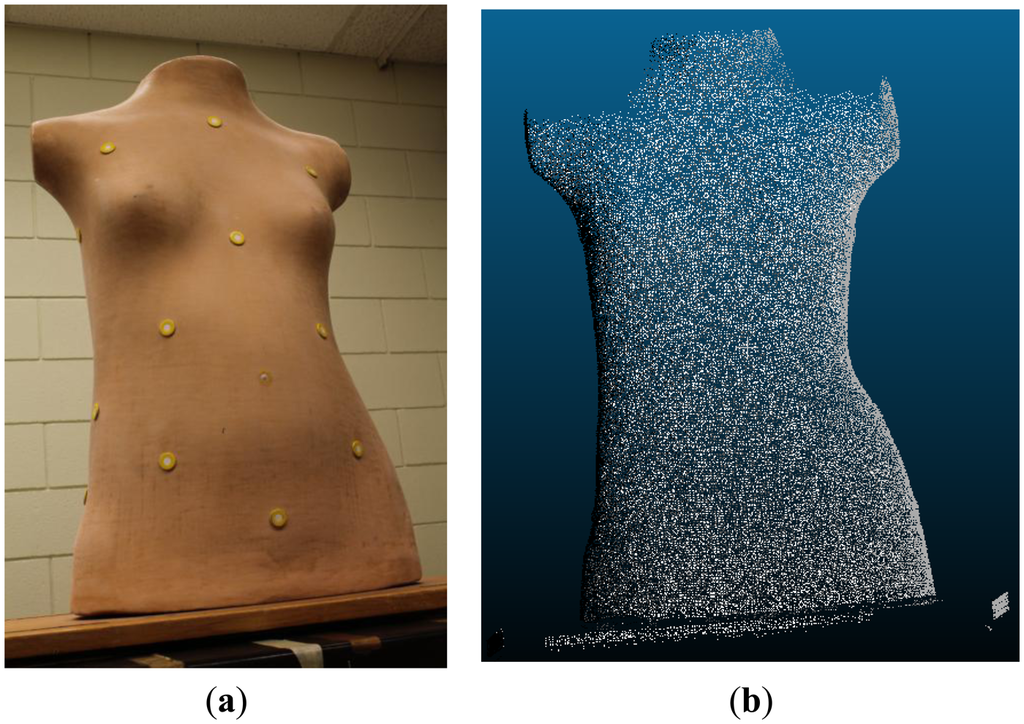 If the system is considered stable, the reconstruction results will be compatible regardless of which IOP/mounting parameter sets are used. To confirm this hypothesis, and thus to double check the validity of the system stability analysis results, a real image dataset is tested next in order to evaluate the impact on the reconstructed object space. This particular photogrammetric system was designed and built for the 3D reconstruction and evaluation of scoliotic torsos. Thus, a dataset of a scoliotic torso mannequin (see Figure 15a) was used to perform the 3D model reconstruction (see Figure 15b) three times, i.e., once for each set of parameters from the three calibration sessions. Note that the 3D reconstruction was based on sparse image matching at the pixel level.