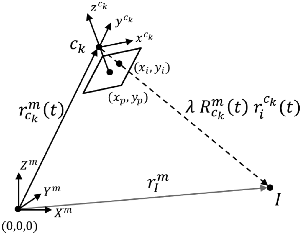 As seen in Figure 8, the coordinates of an object space point relative to the perspective centre of an image from a particular camera can be expressed as the scaled vector from the perspective centre to the original image point in the frame for that camera, ck, after transforming it to the object space/mapping reference frame (see Equation (16)).