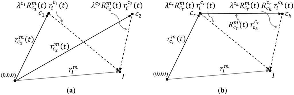 The downside of using such relative orientation constraints is that the complexity of the implementation procedure intensifies with the increase of the number of cameras in the system and the number of observation epochs [25]. The one step procedure used here directly incorporates the relative orientation constraints among all cameras and the body frame/reference camera in the collinearity equations as seen in Equation (9) [25,35,36]: