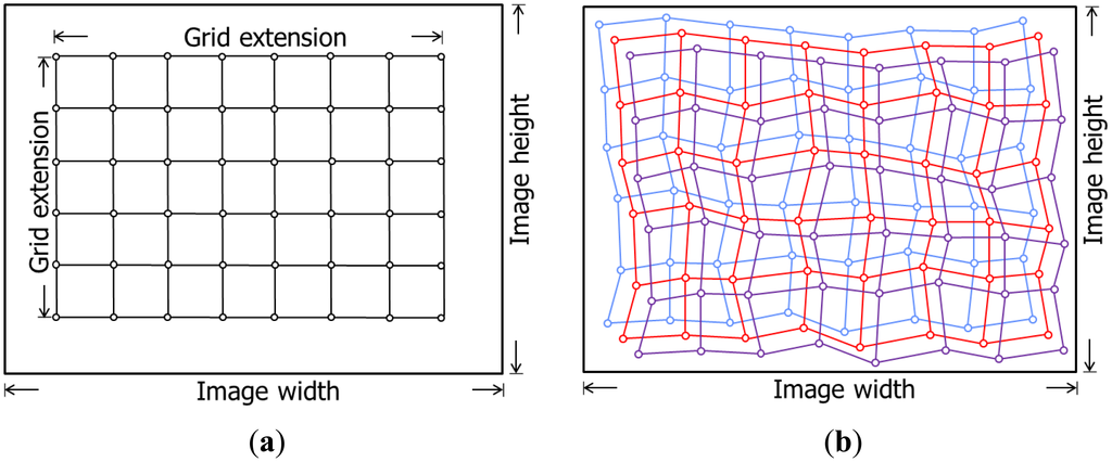 Figure 4. Simulated grid of image points in the format of one camera (a); the projection of the simulated points in the image format of the other camera using different object space depths (b).Use the IOPs and mounting parameters of this camera from the first calibration session to remove the distortions at the grid vertices and compute the object space coordinates of each vertex by forward projecting them to a range of plausible object space depths (see Figure 5);