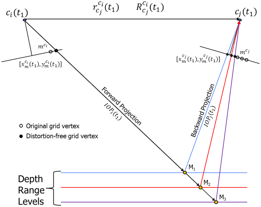 Having estimated the corresponding image coordinates for epochs t1 and t2 in camera cj for all grid vertices and for all depth ranges, the RMSE values for the x and y components can be computed based on the differences shown in Equations (12) and (13):