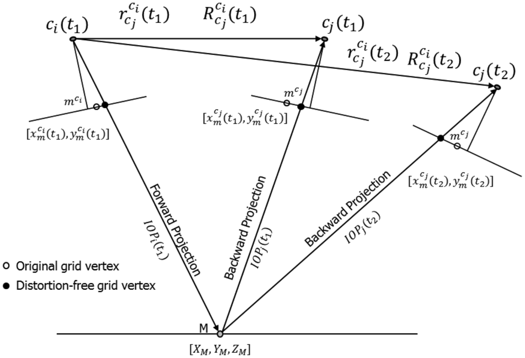 The mounting parameters, and , are now time-independent, and the EOPs of the reference camera, and , now represent the EOPs of the system platform. This model preserves its simplicity regardless of the number of cameras or the number of observation epochs. It should be noted that instead of solving for 6nknt EOP unknowns, the adjustment will solve for 6nt EOPs for the reference camera in addition to 6(nk – 1) mounting parameters for the rest of the cameras with respect to the reference camera. This is equivalent to the total number of independent parameters that are needed to represent the EOPs of the different cameras at all the data acquisition epochs. The reduction in the number of parameters to solve for in the adjustment will also reduce any possible high correlations between the many system calibration parameters. The difference in the bundle adjustment mathematical models described in Equations (3) and (9) is visually summarized in Figure 3.