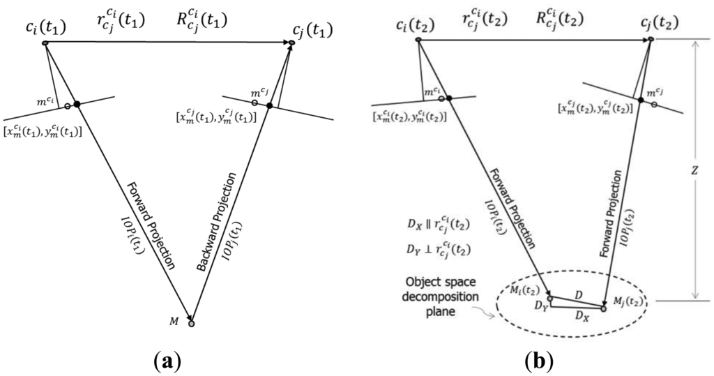 The proposed methodologies for the system stability analysis are: (1) combination of forward and backward projections; (2) object space parallax in image units; and (3) variation in the normalized image coordinates. They are explained in the next three sub-sections.