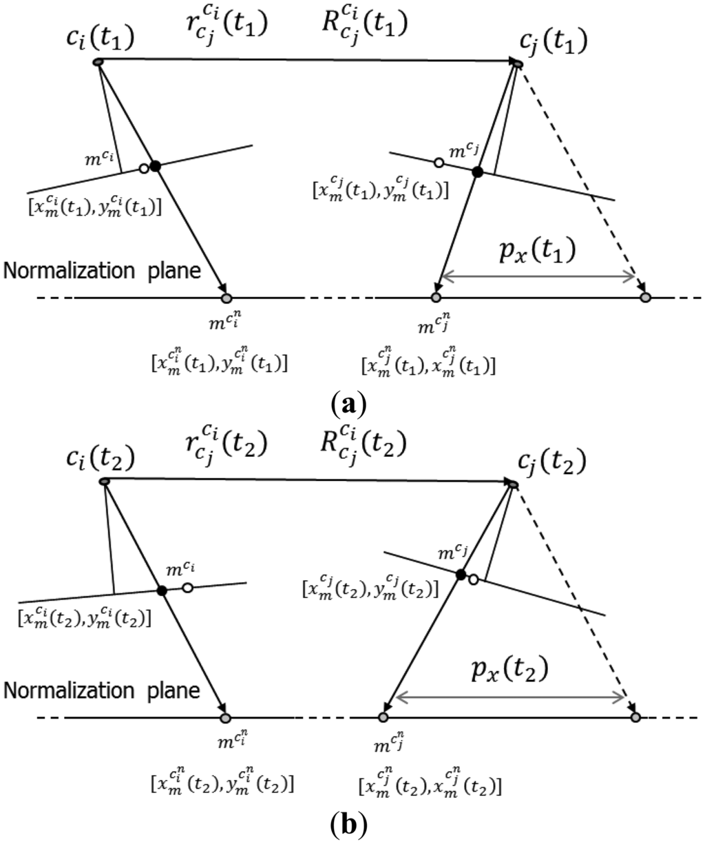 The rotation matrix is based on the angles , , and , and is used to transform the image coordinates from the original image frame to the normalized image frame [40]. It should be noted again that the rotation matrix depends on the baseline components, i.e., . Thus, indirectly, the rotation matrix also depends on the baseline components. It should also be noted that the mapping frame, m, can be chosen to be the coordinate system of camera ci, while ck would correspond to ci and cj when generating the normalized image coordinates for cameras ci and cj, respectively.