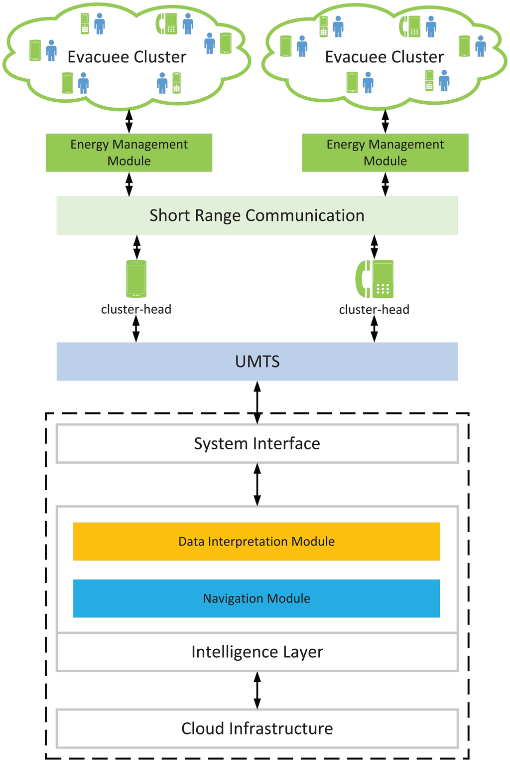 Cloud computing provides a service-oriented architecture that harnesses the computing capability of massive inter-networked computers. Since the concept was explored in the 1960s, the scope of cloud computing has grown tremendously over the last few decades and has motivated considerable research in the field of emergency management. For example, [14] proposes a community-based cloud-enabled emergency management system that leverages existing social network sites (SNS) to collect and disseminate emergent information. This platform consists of a information repository layer and a social networking layer, and a semantics-based query is used to overcome heterogeneous data from diverse organizations. In [15], an intelligent transportation system (ITS) is presented with the aid of vehicular ad hoc networks (VANETs) and cloud computing. Different computational models are available in the cloud to generate the optimum strategy for diverse situations. Simulations are performed in the transportation network of a city where the Lighthill-Whitham-Richards (LWR) model is used to mimic the traffic. Results indicate that this large-scale emergency response system, which can collect and propagate information through different communication modes, overcomes the traditional analogues using media. Because of the handicaps, such as limited battery power and computing speed in the hybrid fire evacuation system (HBFES) [16], which uses mobile phones and radio frequency identification (RFID) to locate evacuees and calculate evacuation routes, in [17], this system is extended by employing an external cloud server to perform computations. Due to the limitations of common indoor positioning technologies and the unavailability of GPS, in [18], a smart phone-assisted system to locate evacuees with pedometry-based localization and image-based positioning is suggested. The cloud-based server can obtain the position of individuals by matching the image snapshots uploaded by evacuees and then provide uncrowded routes for users. However, current cloud-enabled emergency response systems with the aid of portable devices do not consider the impact of significant energy utilisation in the client side during the communication process. On the other hand, smart phones using the Universal Mobile Telecommunications System (UMTS) protocol require base stations and a substantial infrastructure, which may be destroyed or overloaded during an emergency. Furthermore, UMTS systems themselves can easily come under attack [19,20], including by various forms of denial of service attacks [21].
