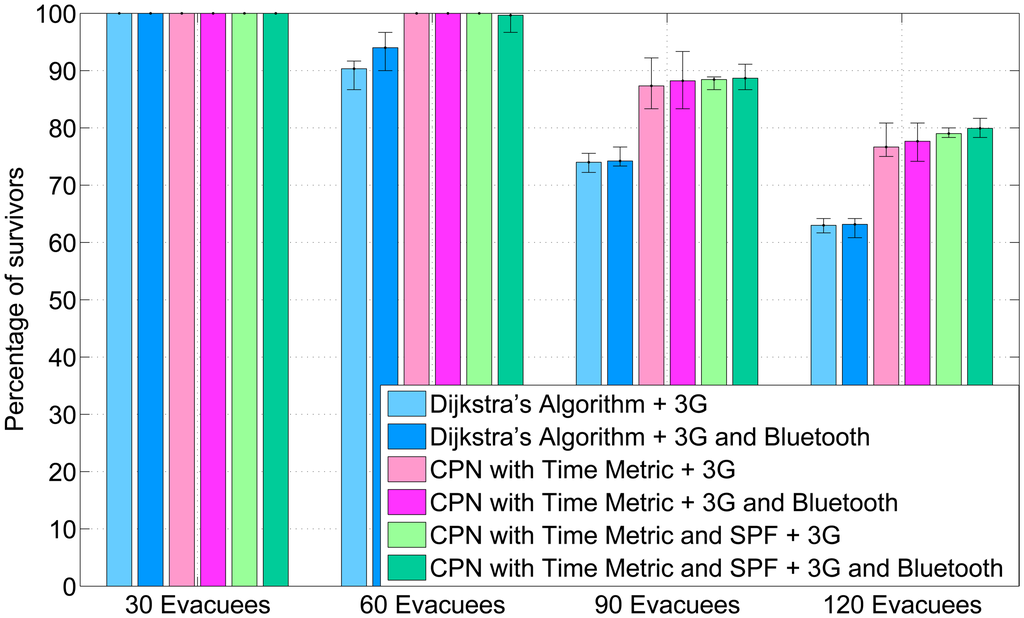 The percentage of survivors of five randomised experiments is shown in Figure 3. Owing to the benefit of wide paths in the shopping mall, all civilians are able to evacuate at a low occupancy rate (30 evacuees). However, in relatively high population densities, both CPNST and CPN&SPF result in more survivors than Dijkstra's shortest path algorithm. This is due to the congestion-ease mechanism in CPNST. Meanwhile, SPF can also ease congestion, because it can generate large repulsive forces for the evacuees in proximity. In comparison with CPNST, CPN&SPF performs slightly better in densely-populated scenarios (90 and 120 evacuees). This is because CPN&SPF organises evacuees as loose clusters and, therefore, increases the likelihood for an evacuee to upload data through other smart phones with more remaining battery power. As a result, the probability of being trapped due to the depletion of the smart phone is decreased. Furthermore, the coordinated behaviour increases the probability of an evacuee with a depleted smart phone to follow other evacuees rather than wandering in the building. This can be confirmed by the fact that the outcome of experiments using the AHCPN energy-efficient protocol is better than for the counterparts that use UMTS directly. The AHCPN protocol can reduce the likelihood of depleting a smart phone and, therefore, decreases the possibility of an evacuee being trapped in the built environment. The results we present are numerical in nature, while it would be interesting also to discuss detailed simulations in a virtual reality environment [58].