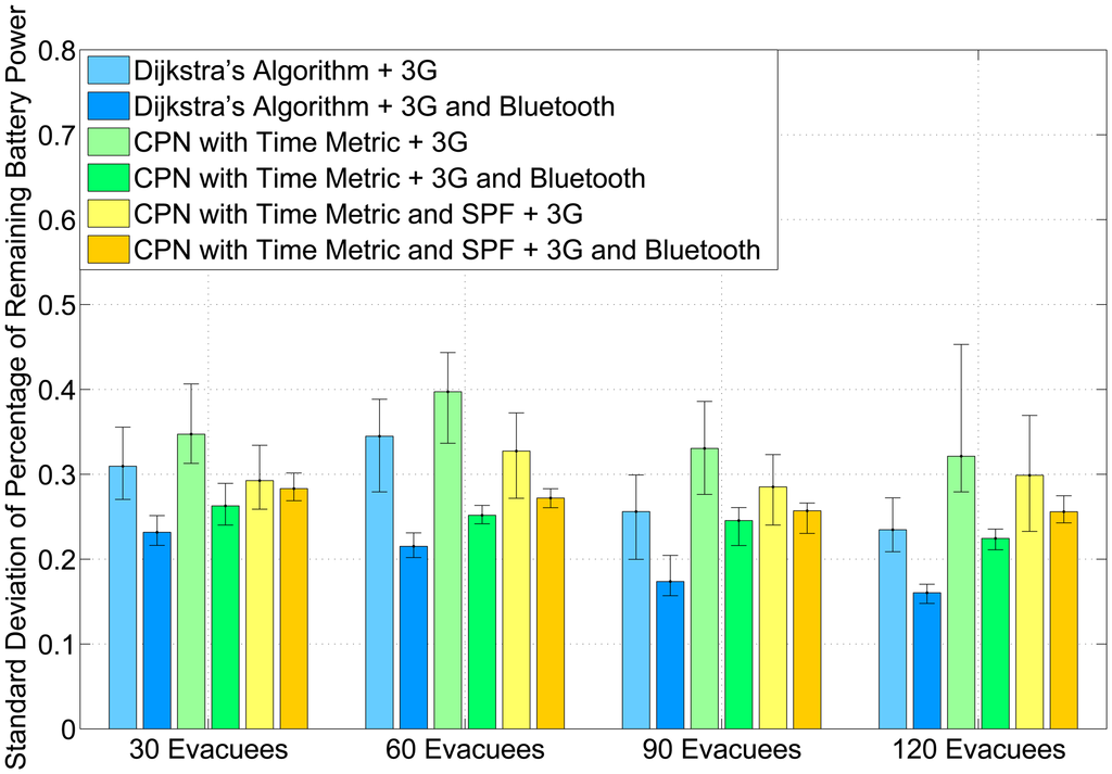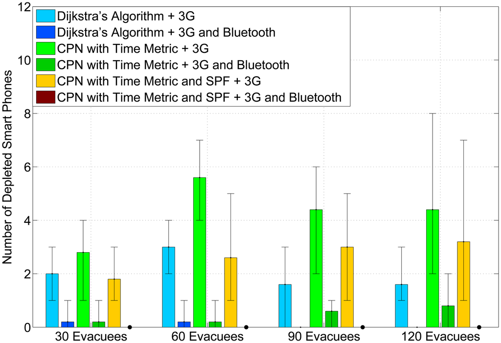 To evaluate the navigation algorithm that combines CPN and SPF (CPN&SPF) as well as the AHCPN-based energy-efficient protocol, we design an experiment that involves four scenarios with 30, 60, 90, 120 evacuees, respectively. Dijkstra's shortest path algorithm and CPN-based algorithm with a time metric (CPNST) [45] are performed for comparison purpose. Evacuees can communicate with the cloud through UMTS directly or use Bluetooth to relay data to other smart phones with a higher percentage of remaining energy and then transmitting to cloud severs through 3G.