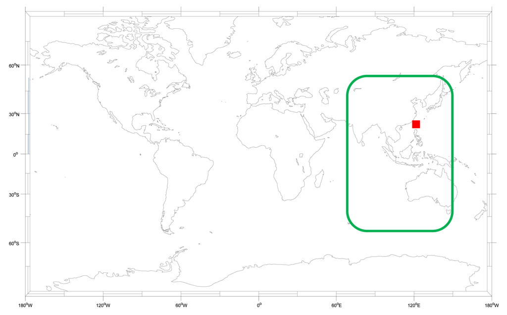 Recently, the Chinese BeiDou Navigation Satellite System (BDS) has been developing rapidly and now meets the open service requirements for civilian users []. The service area of the current BDS is 55°S∼55°N, 70°E∼150°E, as shown in Figure 1. As a user in Taiwan, it is important to know the benefit of applying the BDS because we can receive the BDS satellite signals all day. This research is based on actual BDS signal in space (SIS) data which is used to analyze the differences between the BDS and the GPS. Moreover, this research also provides suggestions to users who want to combine both systems for positioning.