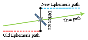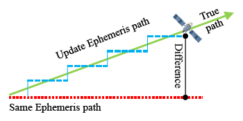 Ephemeris data is more precise than almanac data. Each satellite broadcasts its own ephemeris data. Before user positioning, ephemeris data for each satellite in view must be downloaded first. The information in the ephemeris data helps users to calculate the precise location, inclination and size of the satellite orbit. After that, the user can use the time information to calculate the satellite position on this orbit. However, the satellite position calculated from ephemeris data is not the true location of the satellite []. Due to the fact that an elliptical orbit cannot reflect the real dynamics of the satellite, satellite positions calculated from ephemeris data still have some errors. When one ephemeris updates its own satellite position, the new orbit parameters will create a new satellite orbit. If the satellite moves in a stable manner on its expected orbit, and the orbit parameters in the ephemeris data are provided correctly, the satellite position difference between the new and original ephemeris data will be under a certain value. As shown in Figure 2, there still is a slight difference because the error between the true location and different orbit i.e., the new and old ephemeris orbit is not the same.
